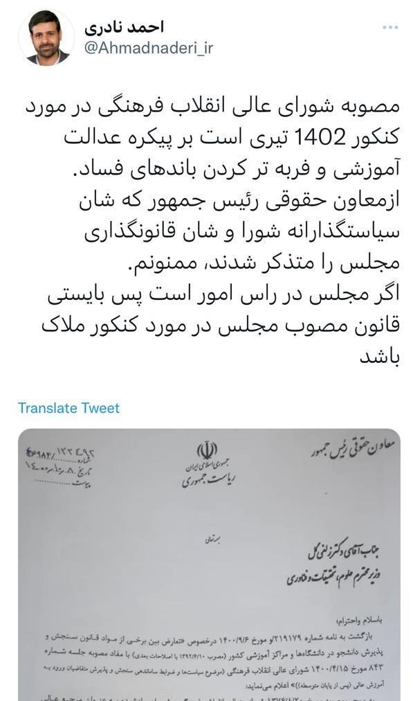 وی در توئیت خود اینگونه نوشت: «مصوبه شورایعالی انقلاب فرهنگی در مورد کنکور 1402 تیری است بر پیکره عدالت آموزشی و فربهتر کردن باندهای فساد.
