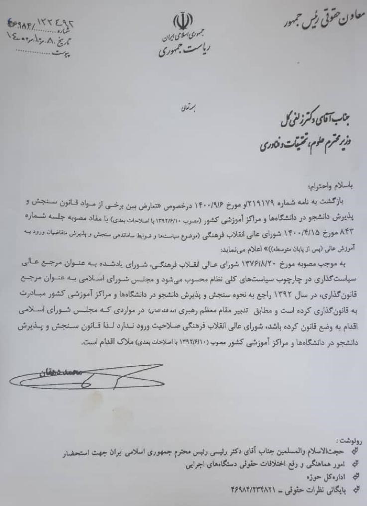با توجه به این وضعیت، احمد نادری عضو کمیسیون آموزش مجلس شورای اسلامی در حساب شخصی خود در فضای مجازی به این موضوع اشاره کرد و از مکاتبه محمد دهقان معاون حقوقی رئیس جمهور با زلفیگل وزیر علوم دراینباره خبر داد.